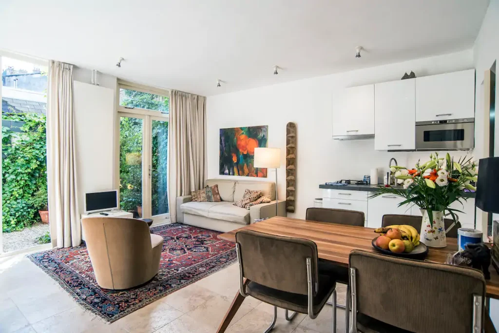 This is a very privat ground floor studioapartment (so no steep stairs) with your own privatgarden , in the peaceful so called backhouse of our canalhouse at the Amstel river. extremely central yet very quiet. A privat marble bathroom/ toillet, privat kitchen+ privat (Miele) washingmachine / dryer(etc.).2 minutes away from Central Station( subway), 9 minutes from World Trade center(subway). The subway entrance is 2 minutes